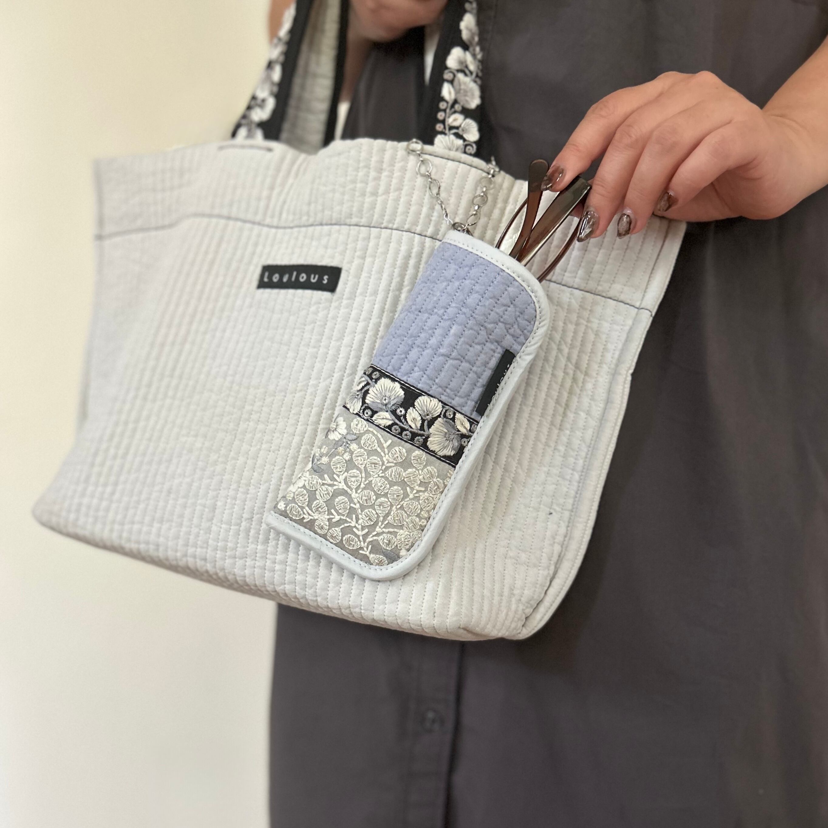 刺繍に縫い込まれた極小スパンコールがバッグの中でさりげなく煌めきます。