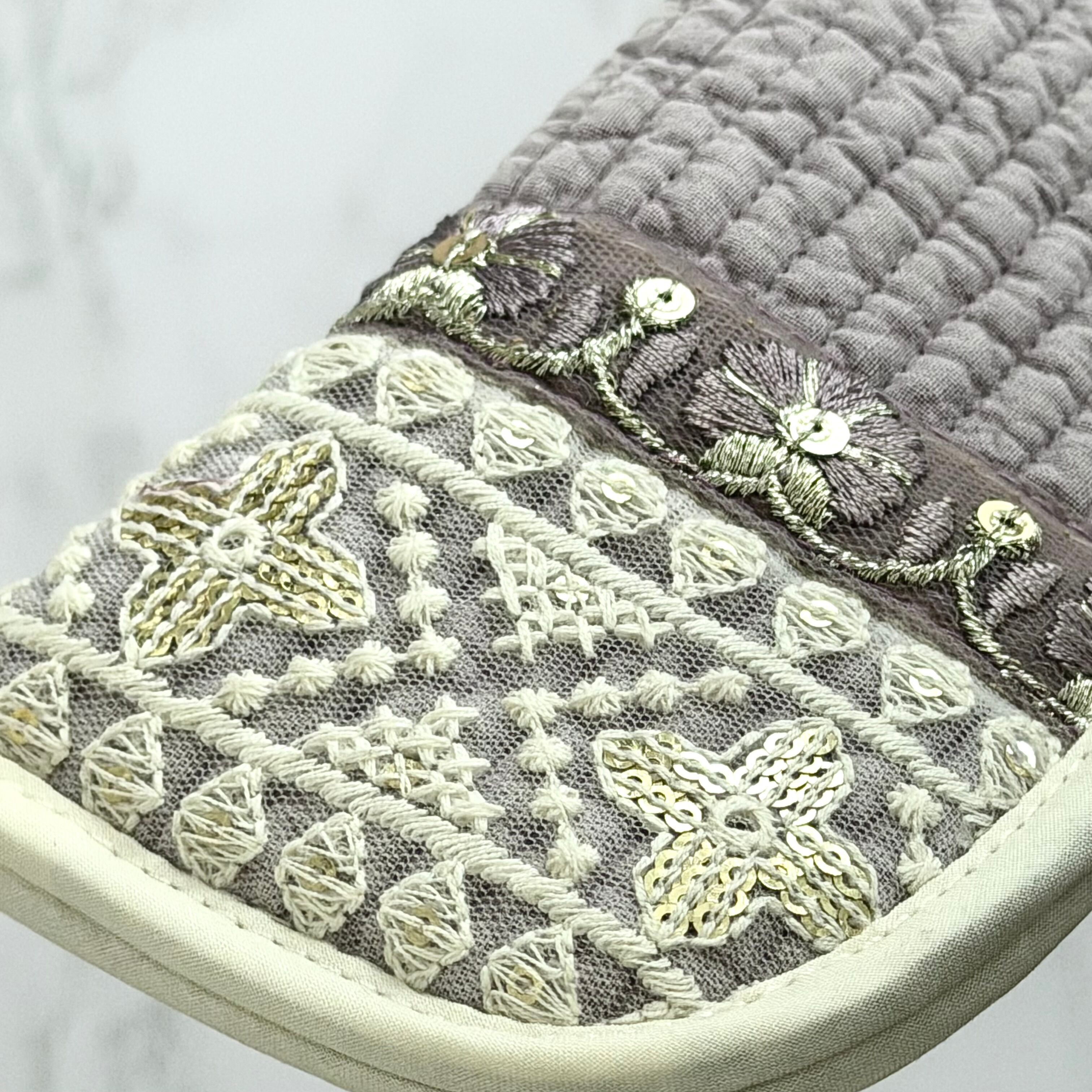 刺繍に縫い込まれた極小スパンコールがバッグの中でさりげなく煌めきます。