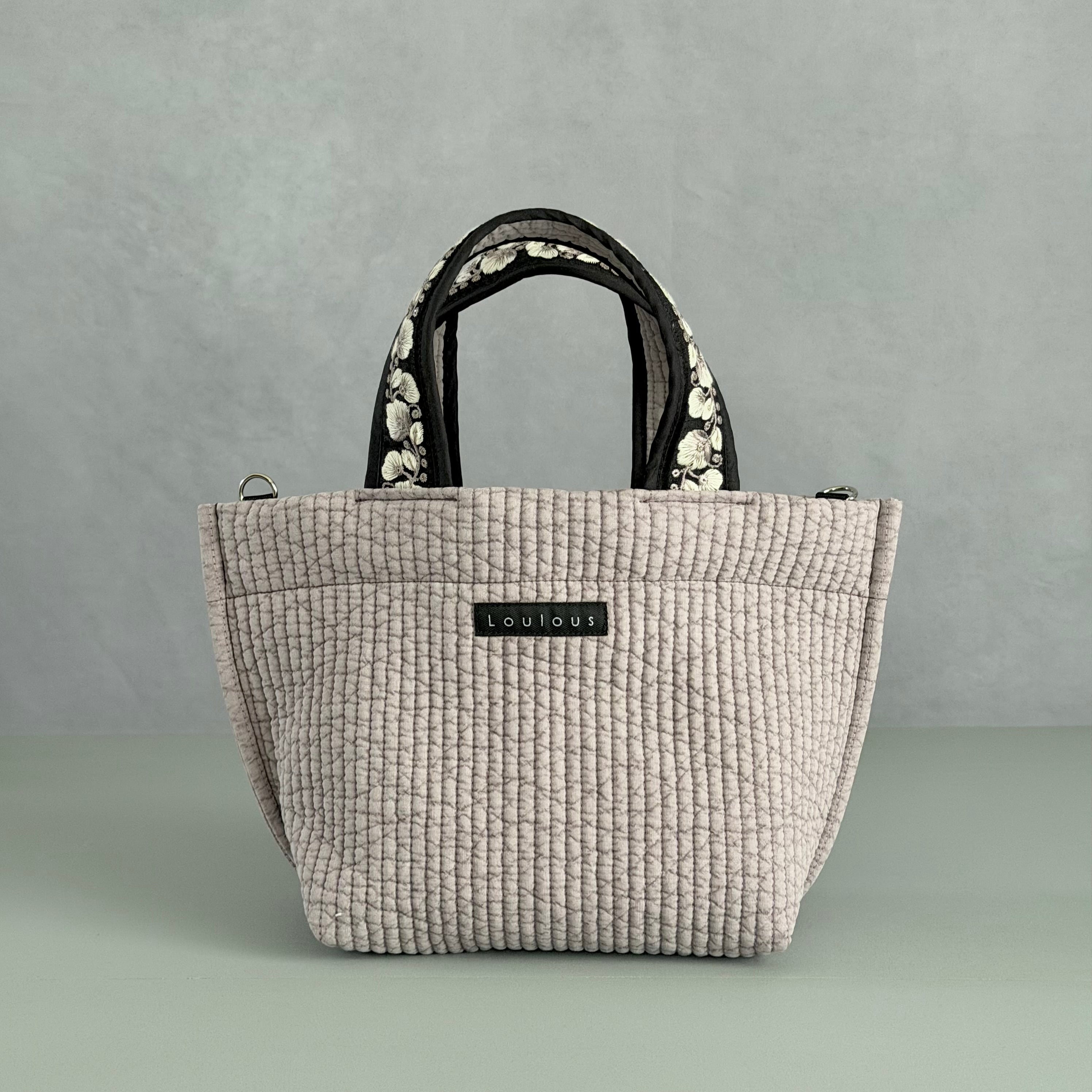 同じ色味の刺繍が施されたリボンとバイアステープをブラックでまとめることで、キリッと引き締まり洗練された印象のバッグに仕上がりました。
